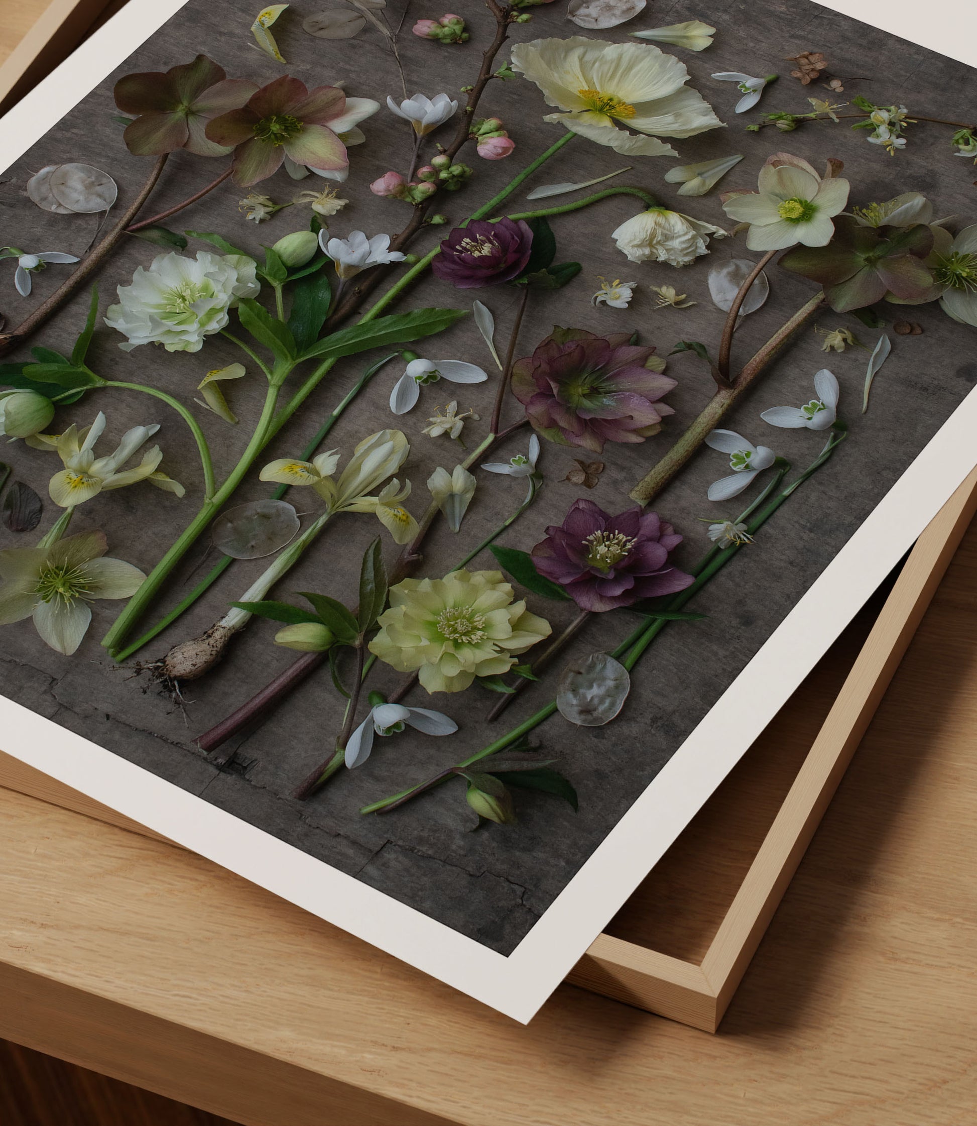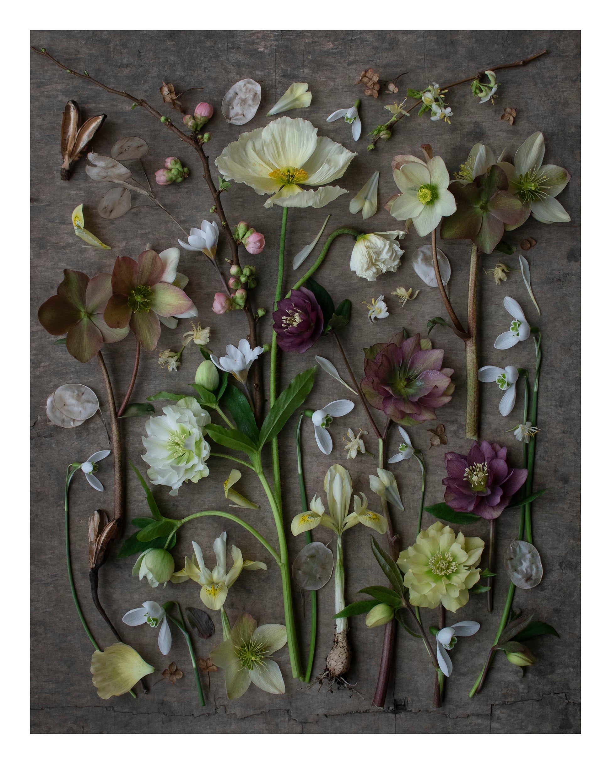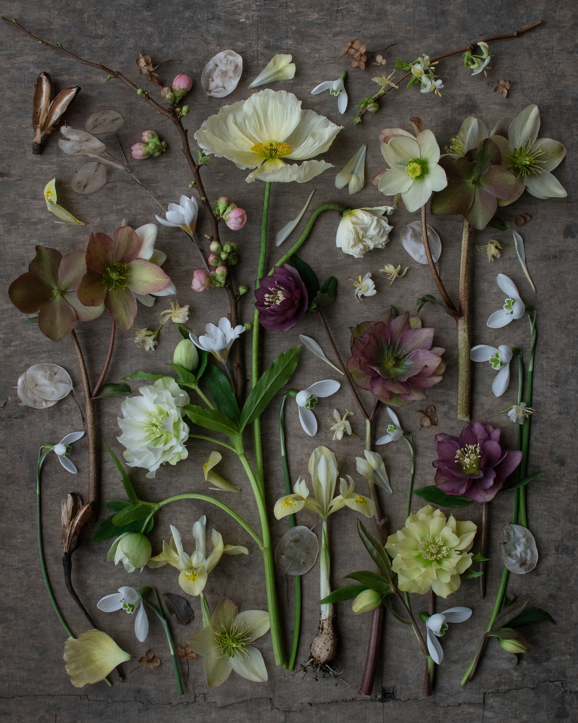 * Names of plants in this picture: Helleborus, Galanthus, Iris ‘Katharine’s Gold’, Chaenomeles, Lonicera fragrantissima, Crocus, Lunaria annua seed heads and glasshouse grown Papaver nudicaule.