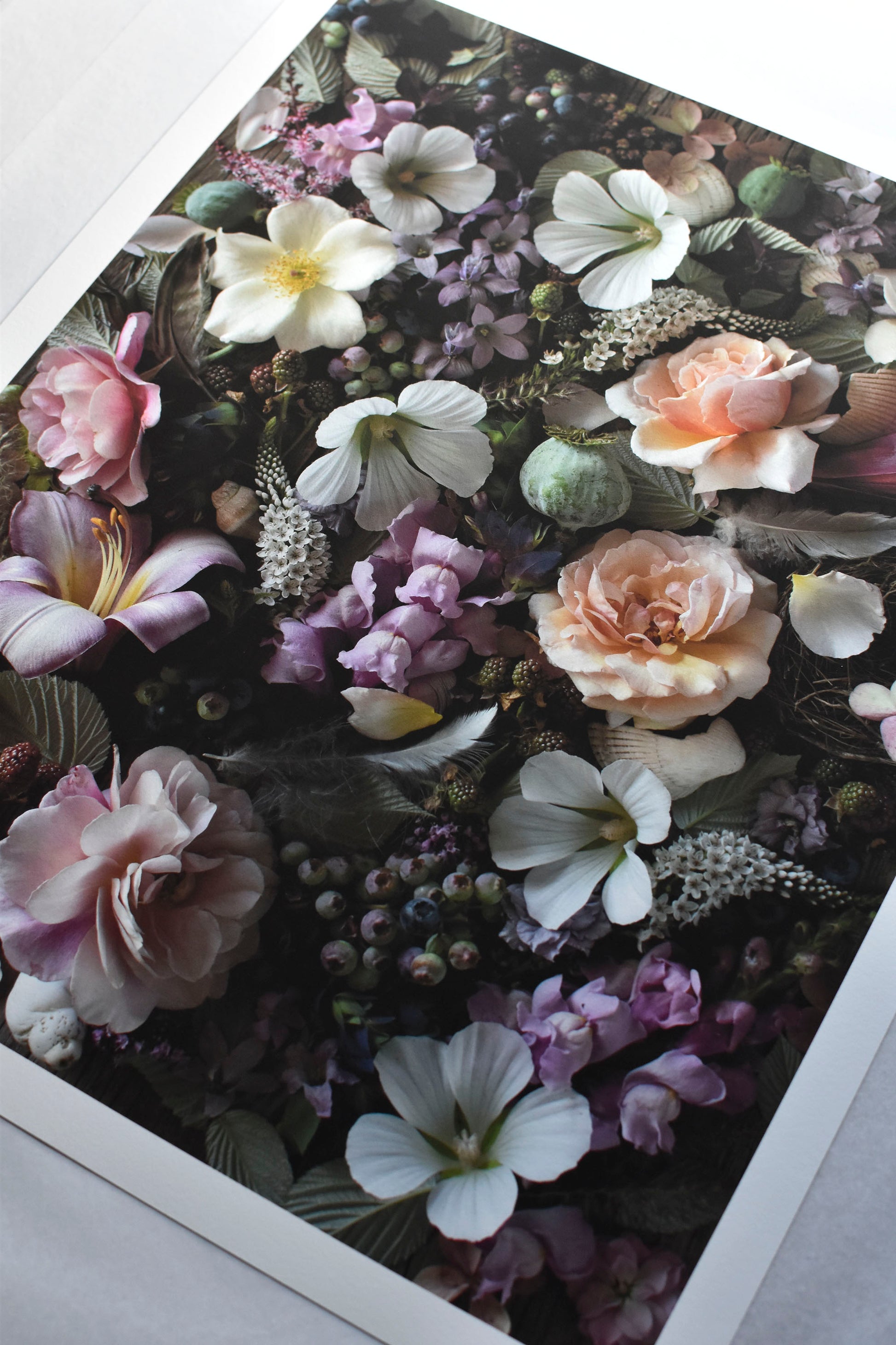 This print celebrates the flowery abundance of a midsummer day in the garden. The striking lilac snapdragon first caught my eye, and I paired it with scented lilies of a similar colour. Glistening, not-quite-ripe raspberries and dusky blueberries were gathered too, along with an intricately crafted bird’s nest and feathers, abandoned in a garden hedge. A few shells from trips to the magical pacific northwest coastline make an appearance here too. It was a time of plenty and I wanted to make the most of it.