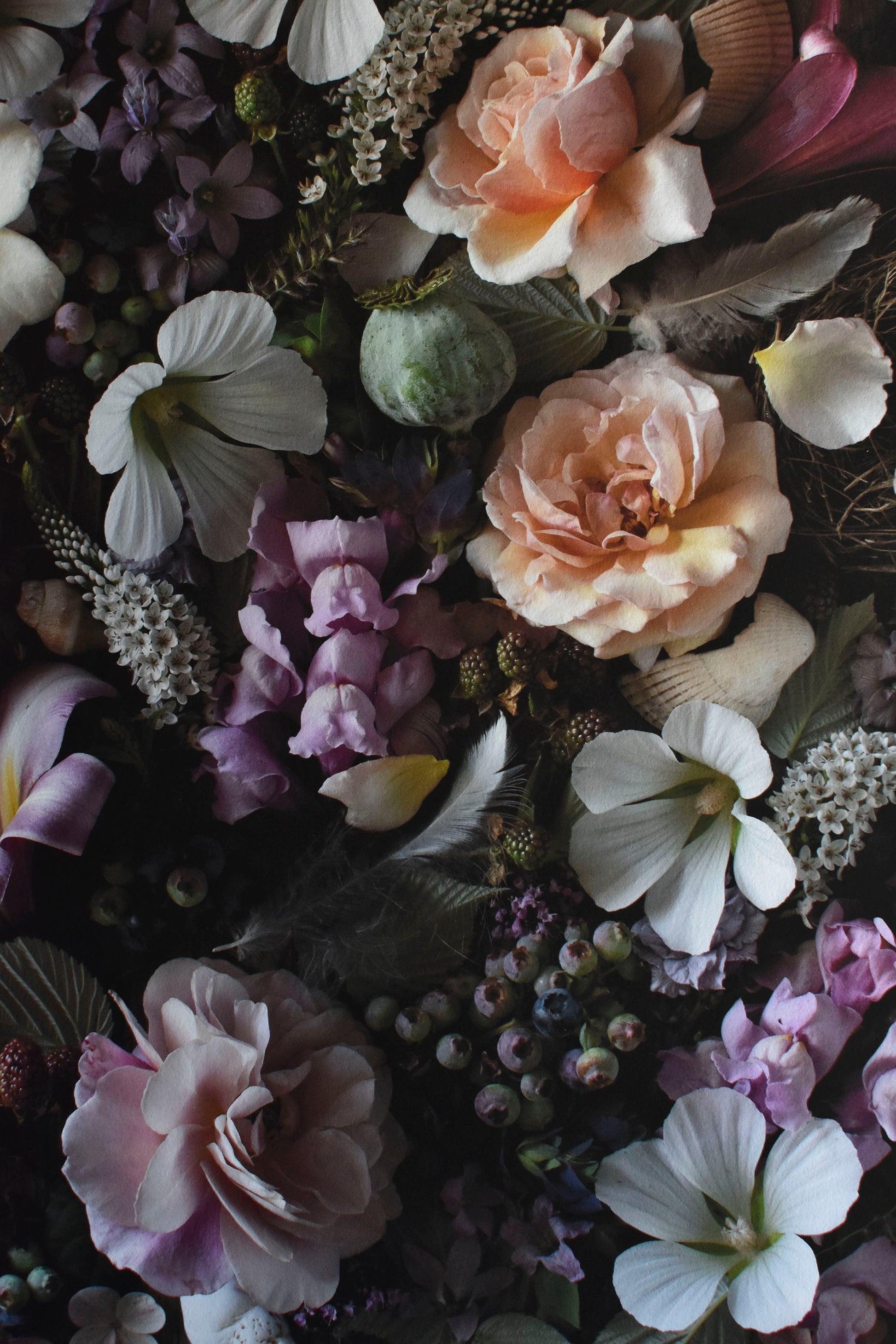 * Names of the plants in this picture: Antirrhinum majus ‘Costa Summer Lavender’, Delphinium consolida ‘Earl Grey’, Malope trifida ‘White’, Rosa ‘Distant Drums’, ‘Sally Holmes’, ‘Betty White’ & ‘Pearlie Mae’, Lysimachia clethroides, Campanula ‘Loddon Anna’, Hydrangea paniculata, Nicotiana ‘Smokey Purple’ & Nicotiana ‘Bronze Queen’, Matthiola incana ‘Appleblossom’, Papaver somniferum seed heads, Vaccinium corymbosum (Blueberry) fruit, Rubus idaeus (Raspberry) fruit & foliage. feathers & shells.