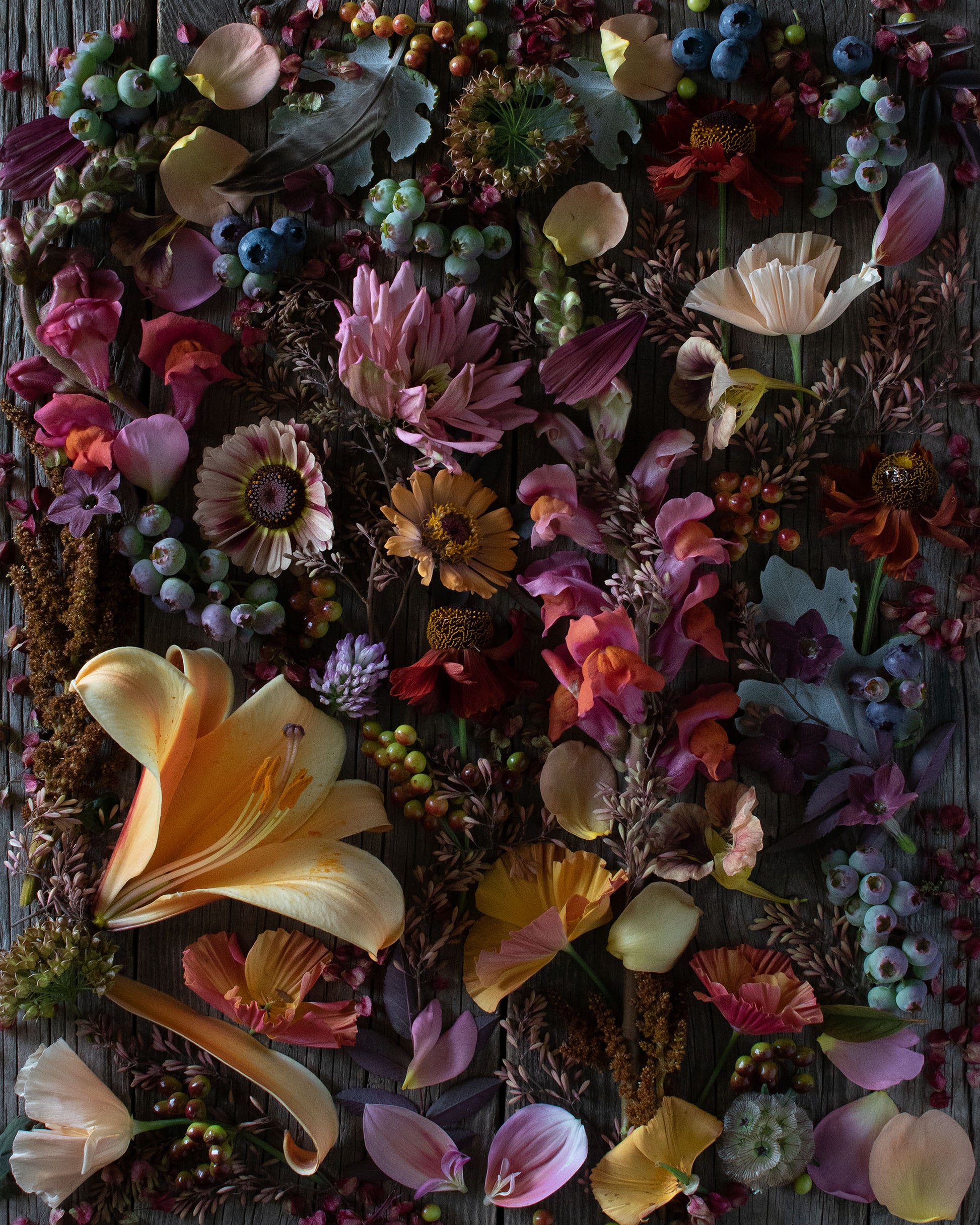 * Names of the plants in this picture: Eschscholzia ‘Thai Pink Champagne’, ‘Apple Blossom Chiffon’ & Thai Silk Strawberry Fields’, Painted Daisy ‘Rainbow Mix’, Blueberry fruits, Viburnum berries, Amaranthus ‘Autumn Touch’, Nasturtium ‘Ladybird Rose’, Nicotiana ‘Smokey Purple’ & ‘Bronze Queen’, Physocarpus capitatus, Plume Poppy foliage and flower buds, Lillium ‘African Queen’, Snapdragon ‘Monaco Orange’ / ‘Opus Early Bronze’, Helenium ‘Moerhiem Beauty’, Clover, Zinnias & a few petals of Dahlia ‘Floret’.