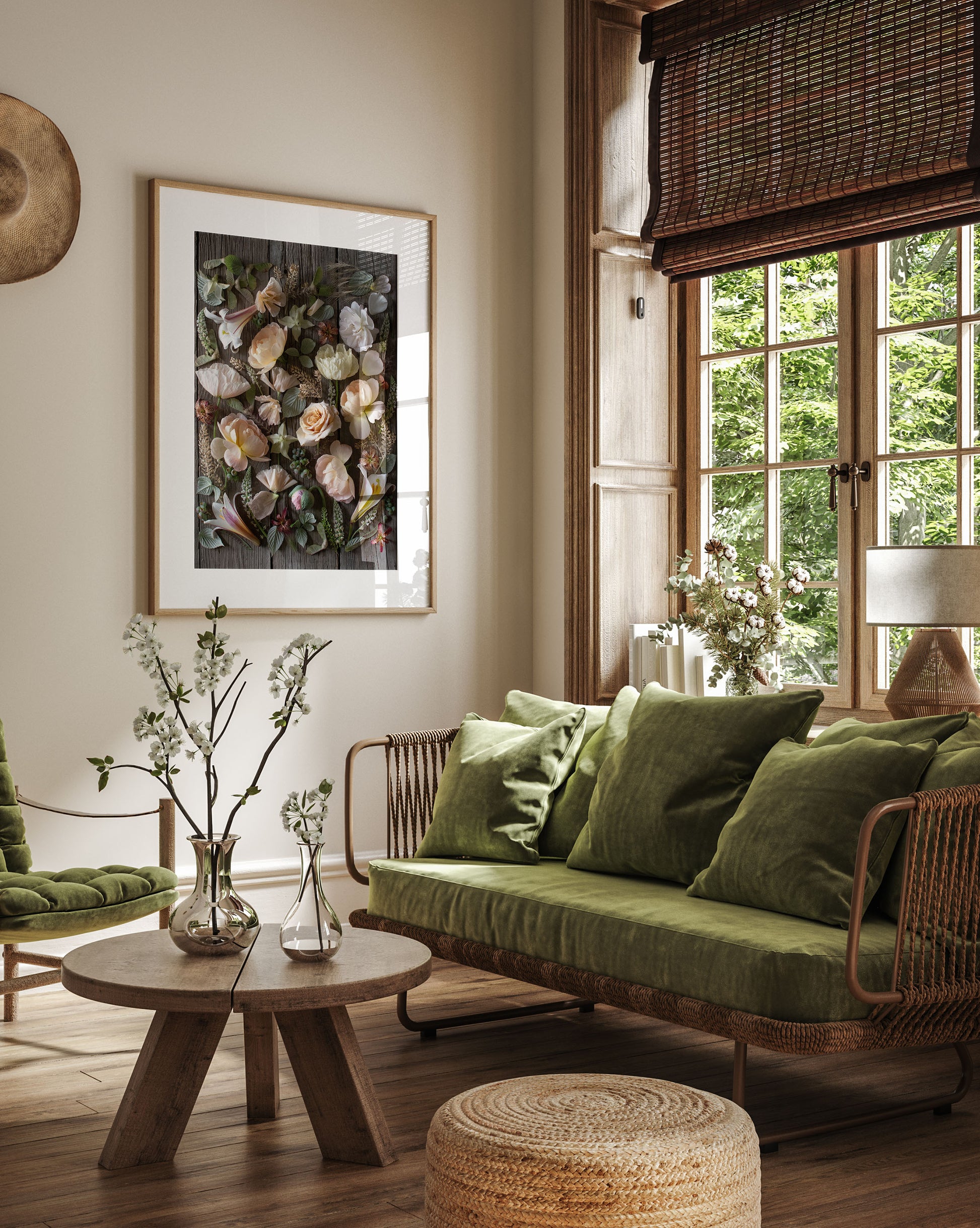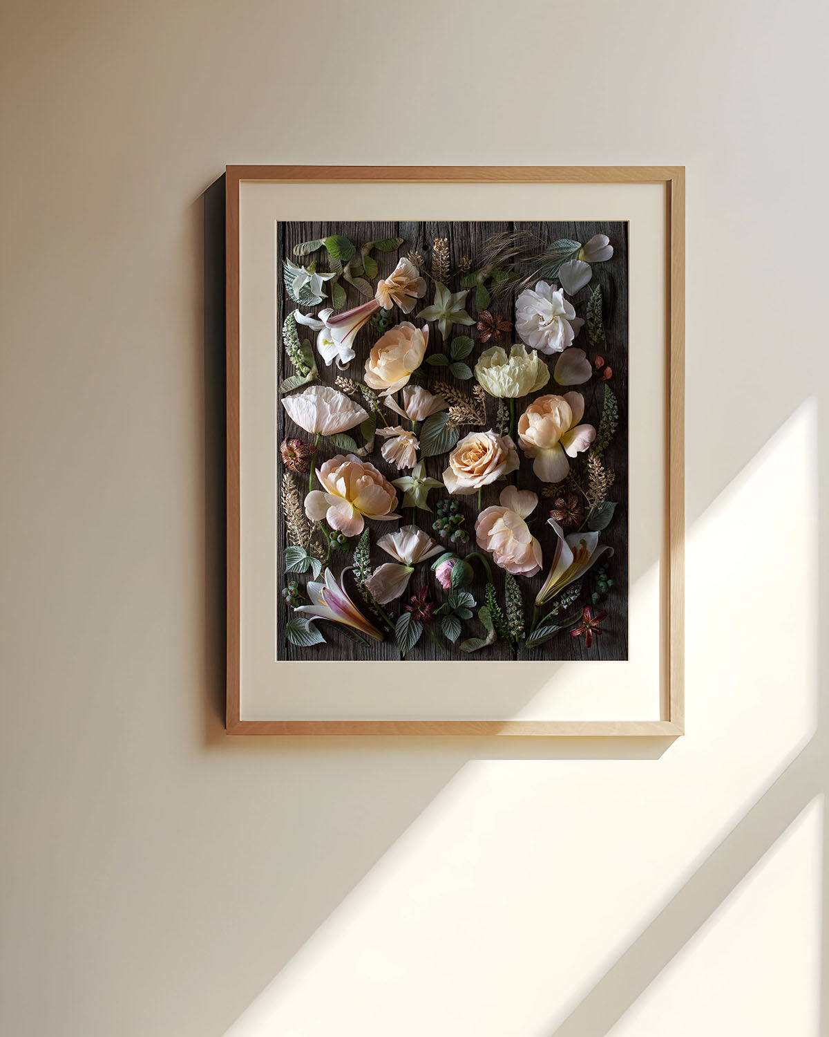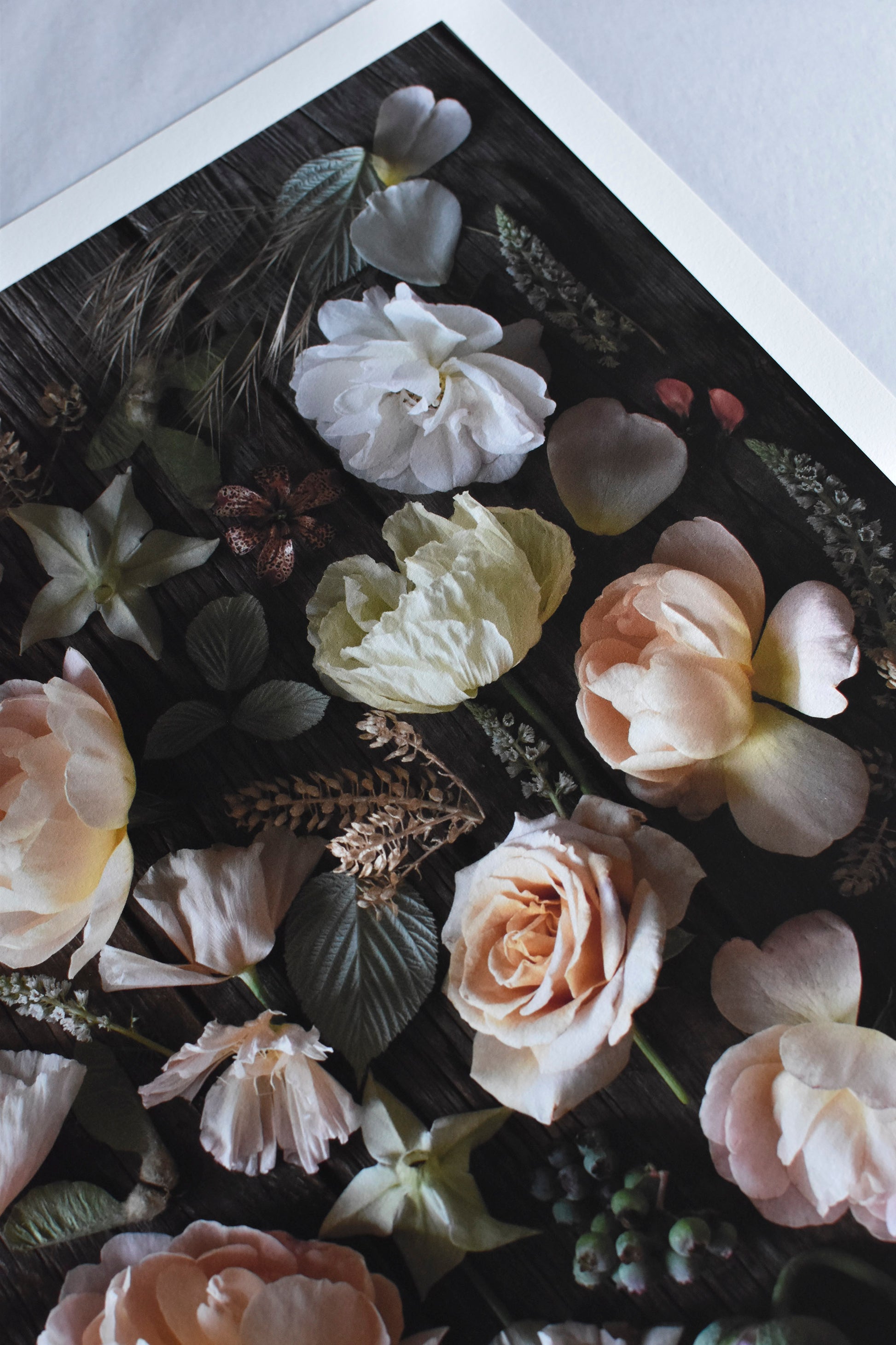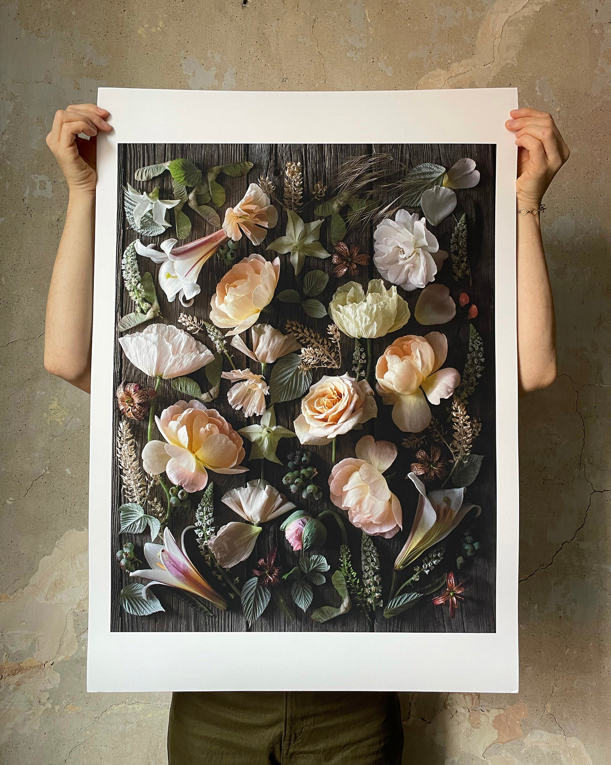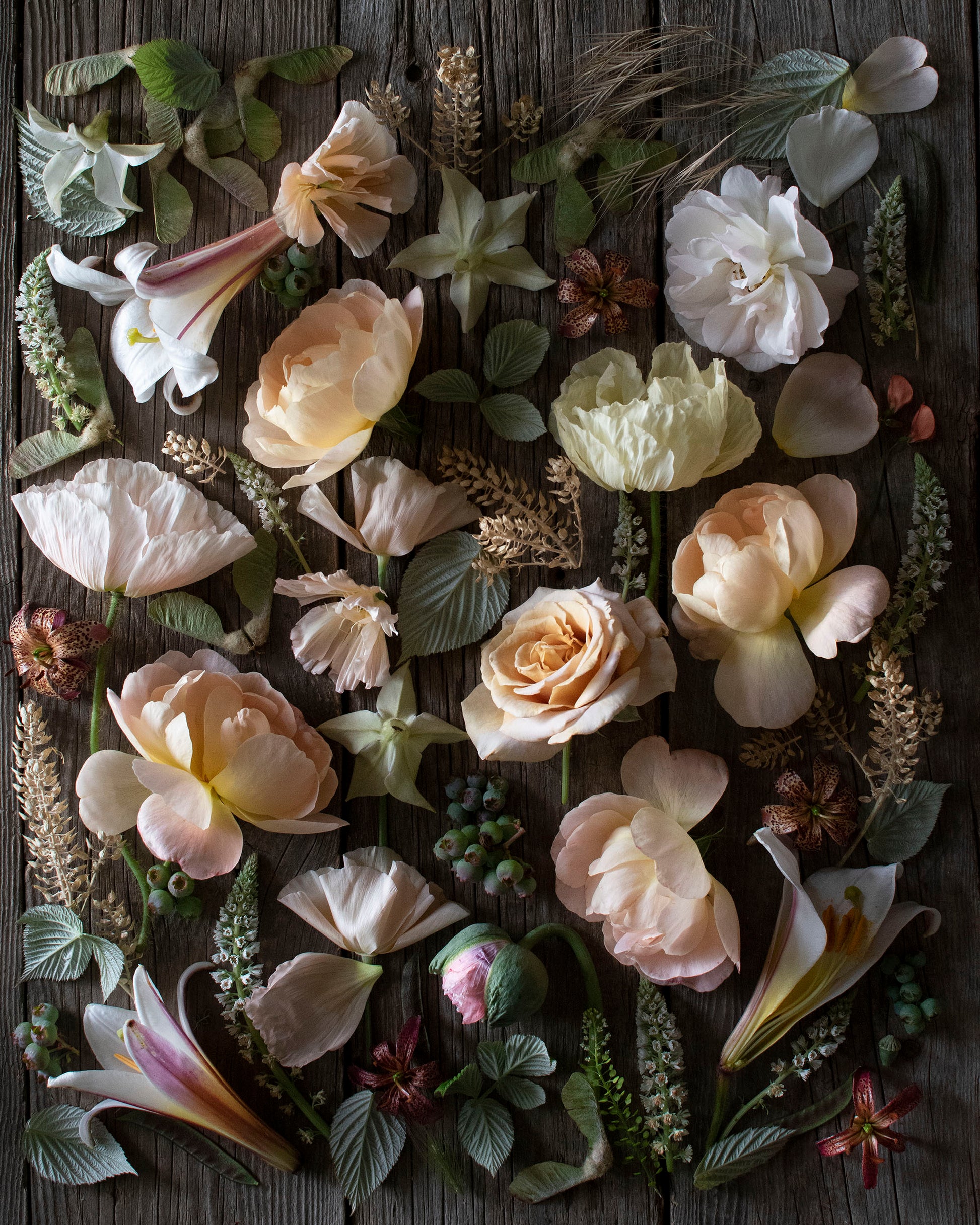 This picture was made in the first summer after I'd moved to America when I was still exploring the new landscape around me. Each day l'd cycle to work past a gorgeously gnarly old Sycamore tree, so one morning I decided to stop to take a closer look at its seedpods. They felt both familiar and different - chunkier and much more furry — to those I was used to seeing back home in England. A few found their way into this picture. Out on the flower farm, my favourite Rose had started to flower. I love Rosa 'Lark Ascending' for its soft apricot blooms in an elegant, open shape, which glow when caught by sunlight. I gathered a few stems and walked the gardens, cutting more roses as well as lilies and poppies; there's the still-crumpled petals of Icelandic poppies and the silky champagne Californian poppies. Out in the orchard the young, still unripe fruits of blueberries were beginning to form, so I picked a pocketful and cut stems of a special raspberry vine with silvery leaves. A new friend took me to favourite places along the coast, where we photographed the scenery and I gathered these seed heads and grasses. The palette for this arrangement was complete and it felt grounding and calming to make and photograph. This one looks beautiful in a natural wooden frame, which picks up on the colours of the roses.