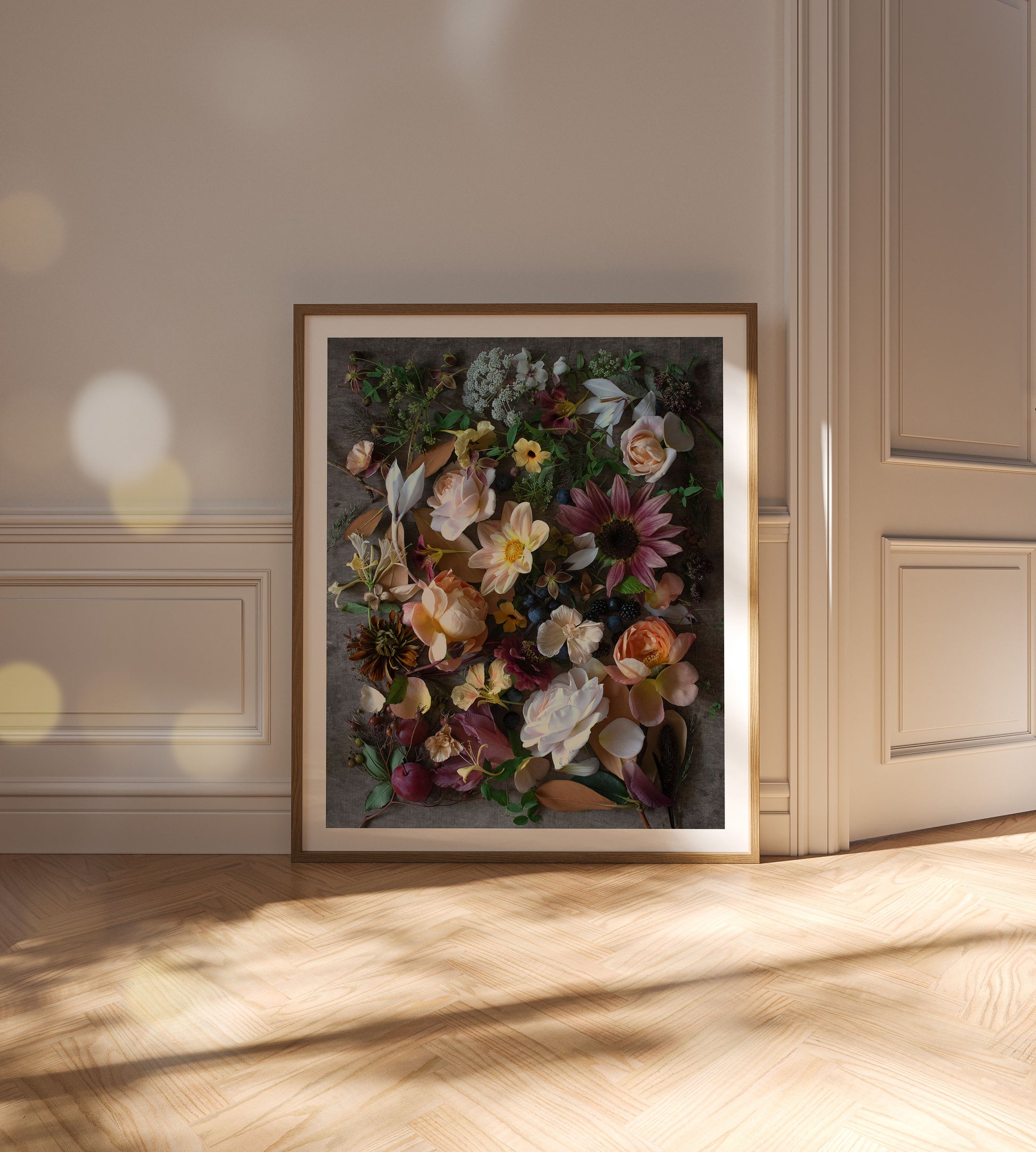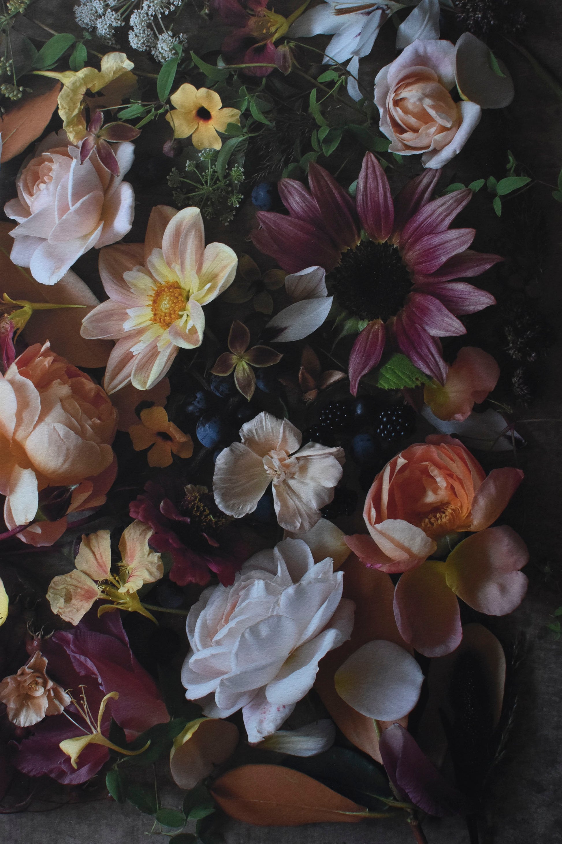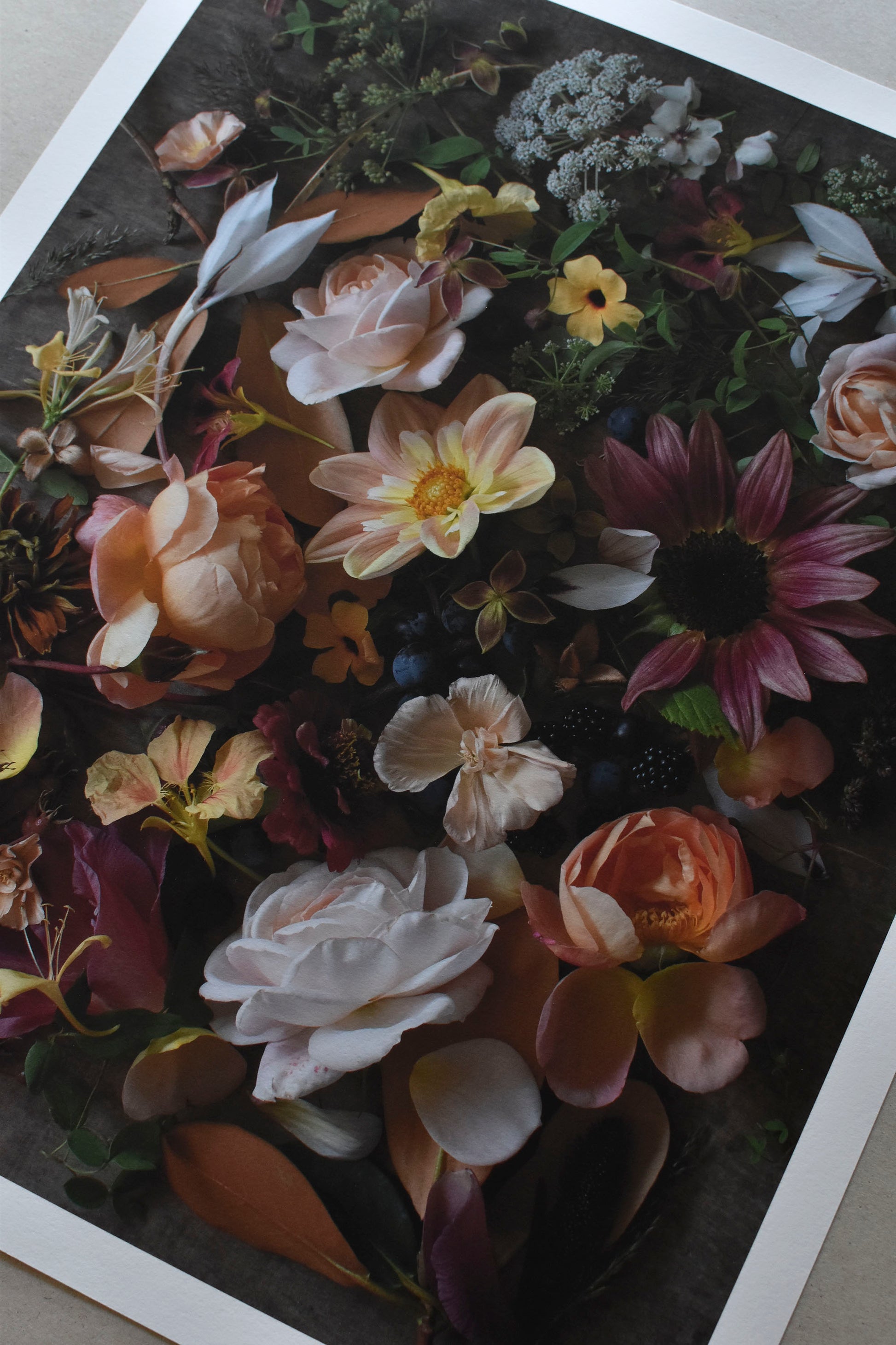September is one of my favourite months, as the intensity of gardening in the summer heat lessens and a hint of autumn hangs in the air. This is the time to wholeheartedly embrace warm, rusty hues and the abundance of berries, fruits, and rose hips. This print captures the essence of September in a cutting garden; dahlias, sunflowers, and gladioli stand tall, as roses offer a second flowering or produce beautiful hips, while nasturtiums scramble, knitting the whole scene together. The inspiration for this piece began with the velvety-amber underside of a rhododendron leaf, discovered on a walk through an enchanting woodland garden.