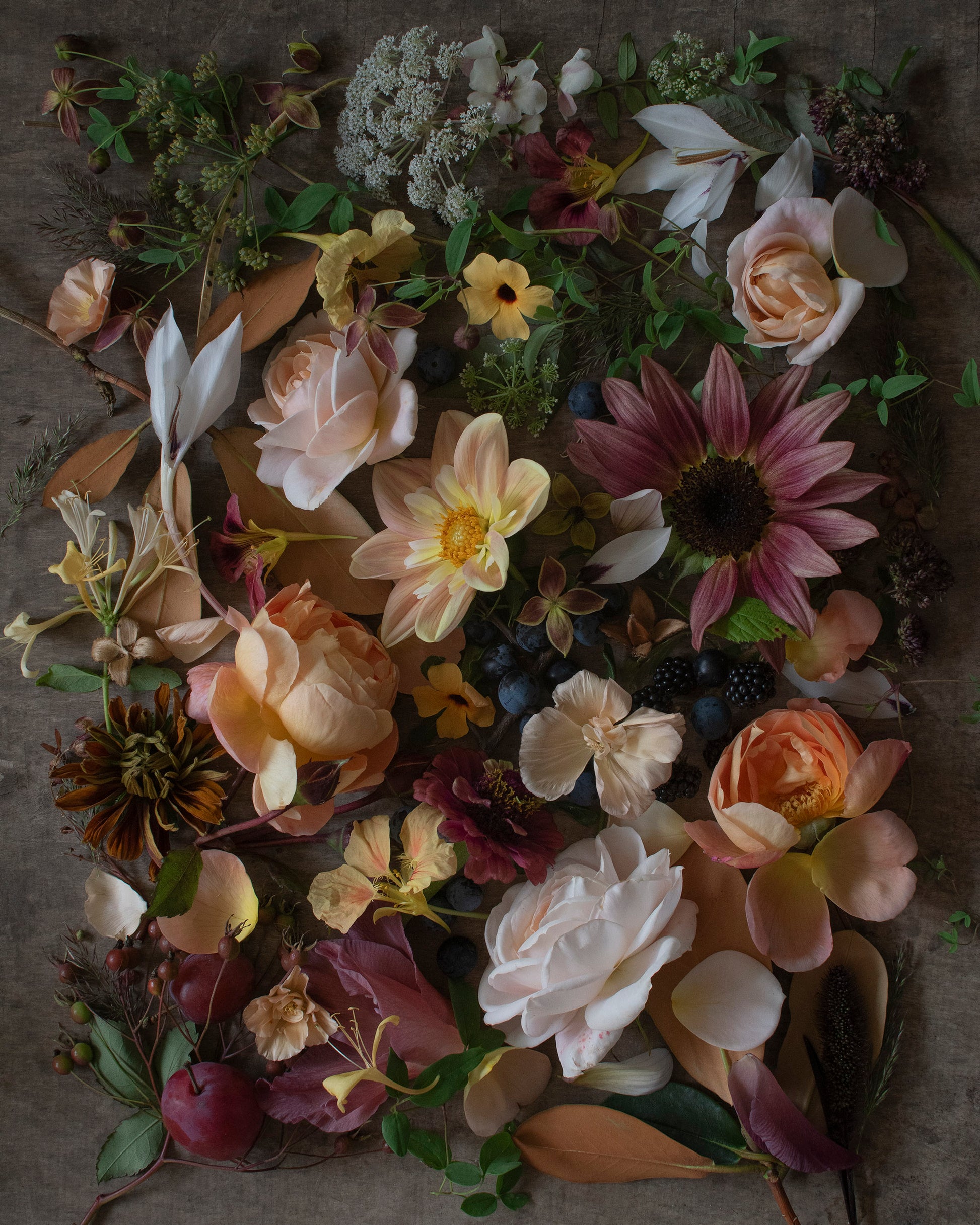 * Names of the plants in this picture: Dahlia ‘April Heather’, Rosa ‘Lady Emma Hamilton’, Rosa ‘Champagne Moment’, Gladiolus murielae, Gladiolus ‘Indian Summer’, Thunbergia ‘African Sunset’, Rudbeckia hirta ‘Sahara’, Eschscholzia ‘Thai Silk Pink Champagne’, Zinnia ‘Queen Red Lime’, Tropaeolum majus ‘Milkmaid’, Selenium wallichianum, Lonicera periclymenum ‘Graham Thomas’, Clematis tangutica ‘My Angel’, Foeniculum vulgare, Origanum vulgare, Helianthus annuus ‘ProCut Plum’, Atriplex hortensis var. rubra, Prunus spinosa, Prunus domestica (Plum) & Rubus fruticosus fruit, Rhododendron foliage & Rosa glauca foliage.